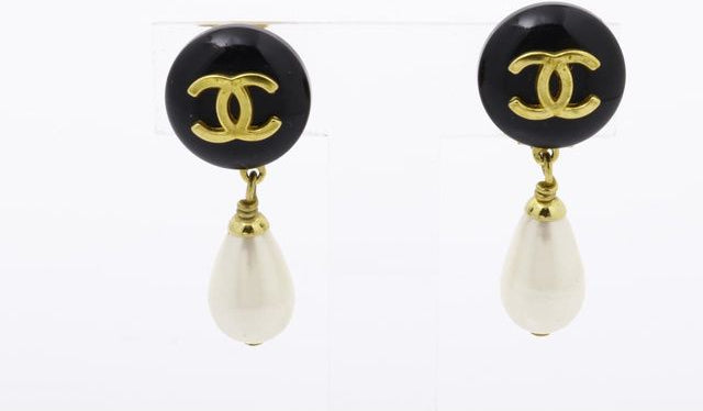 Vintage Chanel CC dangle clip-on earrings. Circa 1995. Made in France. Black with iconic gold CC interlocking logo. Faux pearl dangle. Measures 1.5" in length. Due to vintage age, there are some slight scratches and indentations. Hardware has minimal tarnishing. Comes with certificate of authenticity. Please see photos for wear.