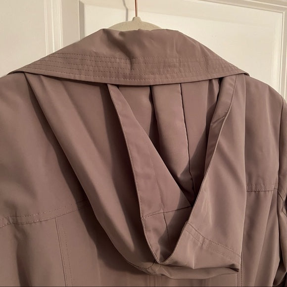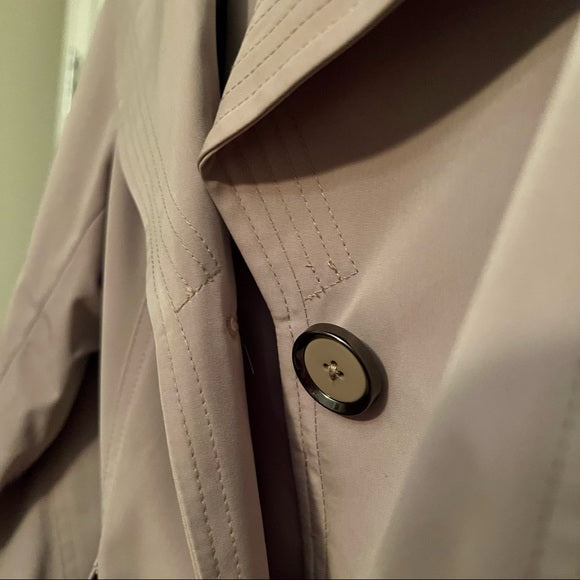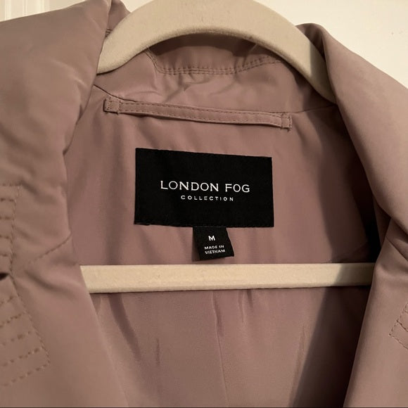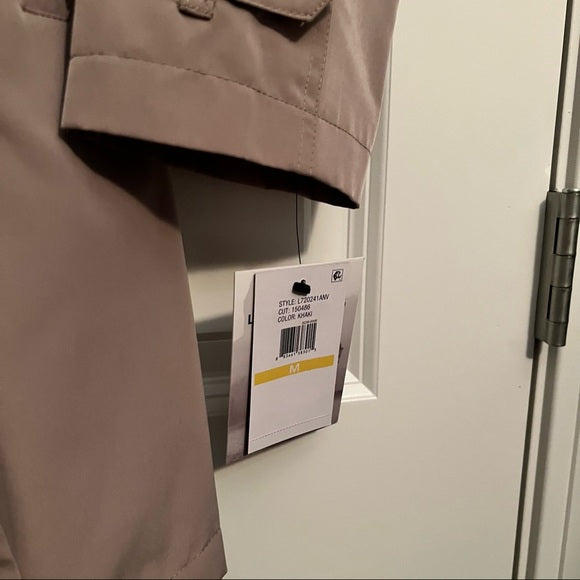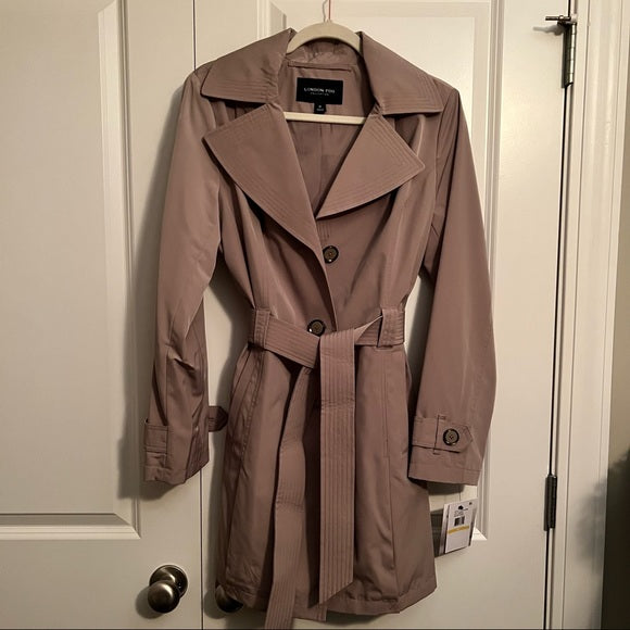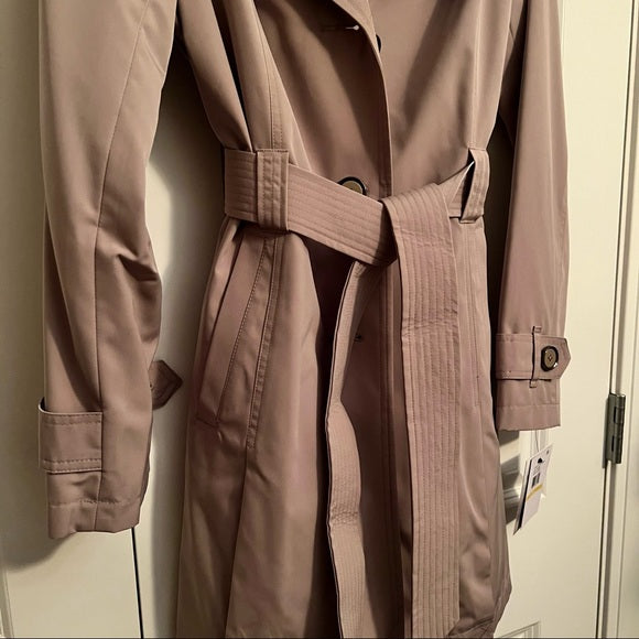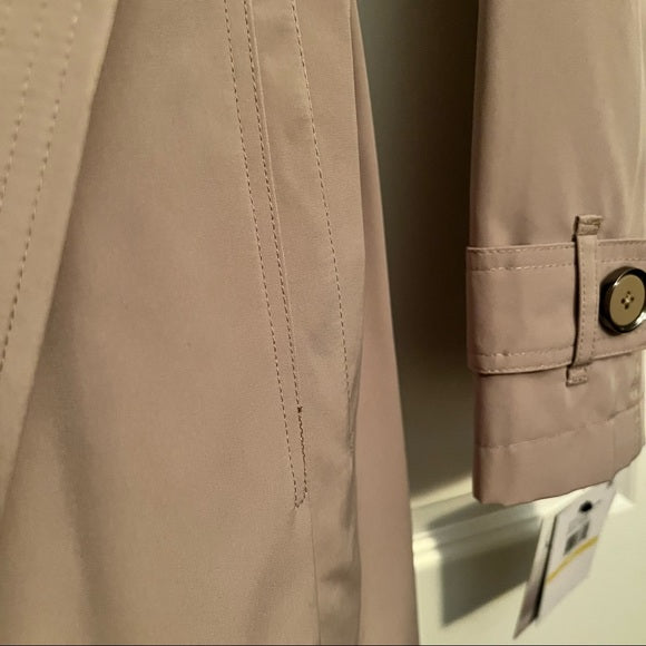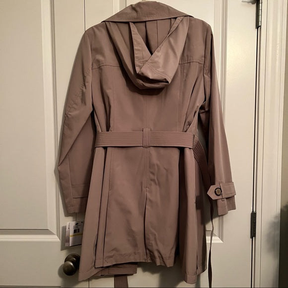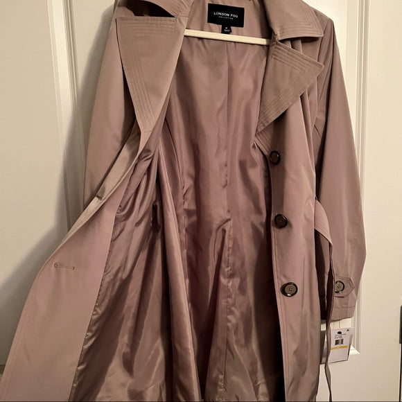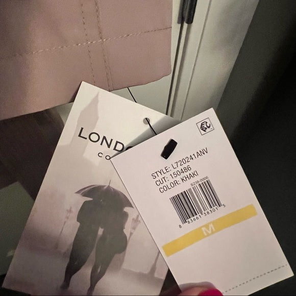 New with tags London Fog double breasted trench coat with removable hood. Khaki color. Size medium. Water resistant jacket with two front pockets and adjustable belt. Original Price: $185.00.